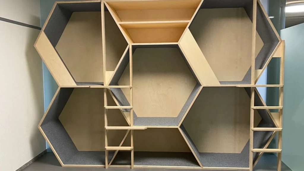 Lernwaben® wirken sich auf die Akustik durch ihre Form und Materialisierung günstig auf die Raumakustik aus. Zusätzlich kann sie mit speziellem Akustikfilz verbessert werden.