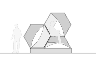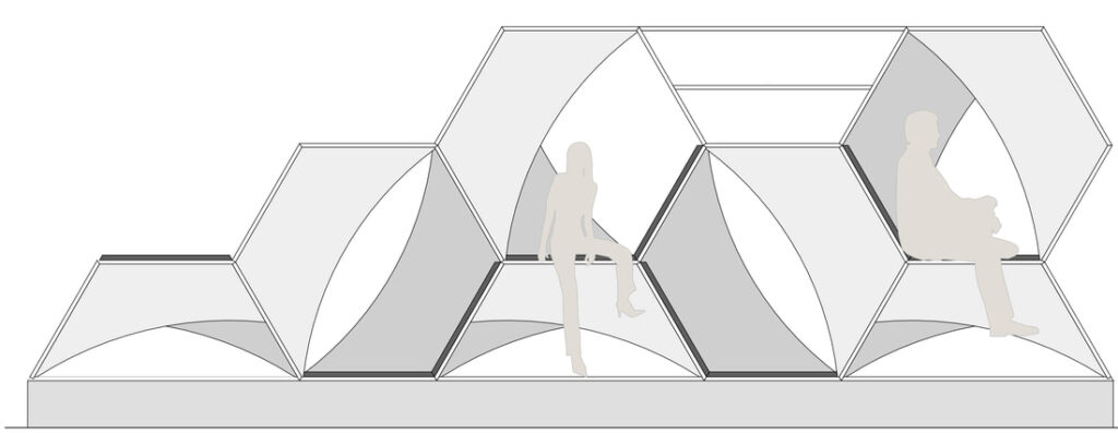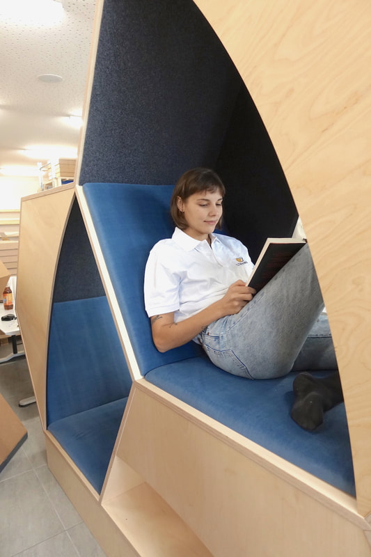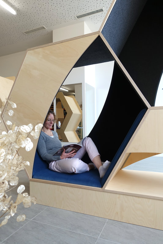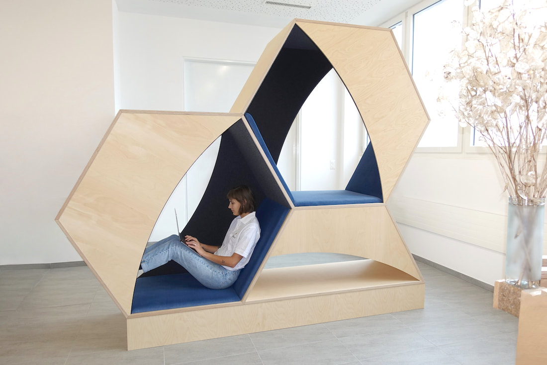 Für Erwachsene, die nicht in die Höhe klettern möchten, bieten wir eine niedrige Wabe an, die teils abschirmt, teils geöffnet ist. Die innere Auskleidung mit Akustikfilz schafft einen angenehmen Rückzugsort, der aber trotzdem genügend Licht und Sicht ermöglicht.